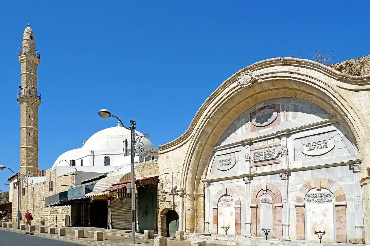 The Mahmoudiya Mosque (, ) is the largest and most significant mosque in Jaffa, now part of the larger city of Tel Aviv. It is composed of a complex of buildings arranged around two large courtyards and a third, smaller, courtyard. The buildings, gates, and courtyards were built at different stages throughout the 18th and 19th centuries while Palestine was under Ottoman rule. Read more on Wikipedia