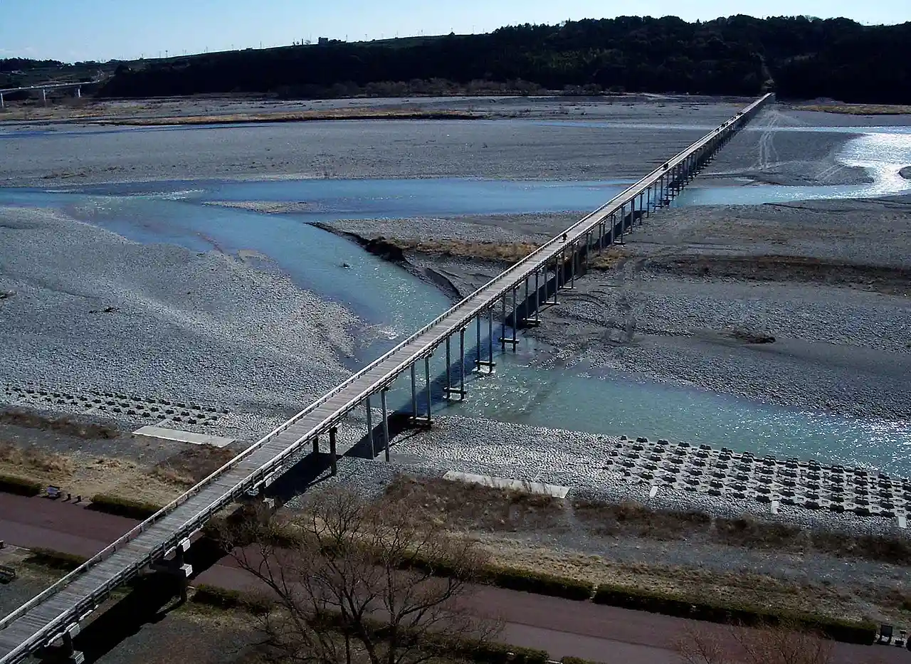 The is a wooden pedestrian bridge over the Ōi River located in the city of Shimada, Shizuoka, Japan. It was constructed in 1879. With a length of , the bridge was registered in The Guinness Book of Records as the longest wooden walking bridge in the world in 1997.Learn the longest wooden footbridge in the world Hōrai Bridge is (In Japanese) Read more on Wikipedia