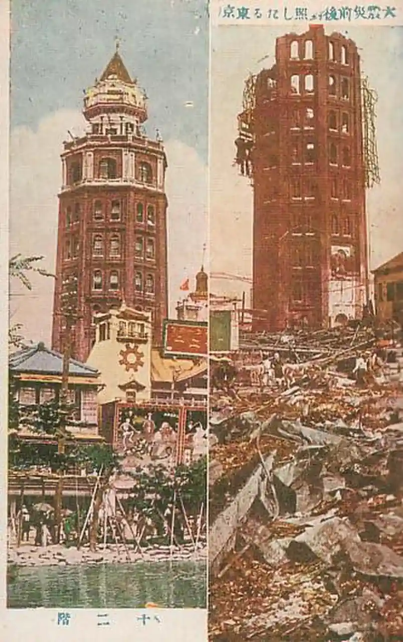 The was Japan's first Western-style skyscraper. It stood in the Asakusa district of City of Tokyo (now Taitō, Tokyo) from 1890 until its demolition following the Great Kanto earthquake of 1923. The , as it was affectionately called by Tokyoites, was Tokyo's most popular attraction, and a showcase for new technologies. It housed Japan's first electric elevator. Read more on Wikipedia