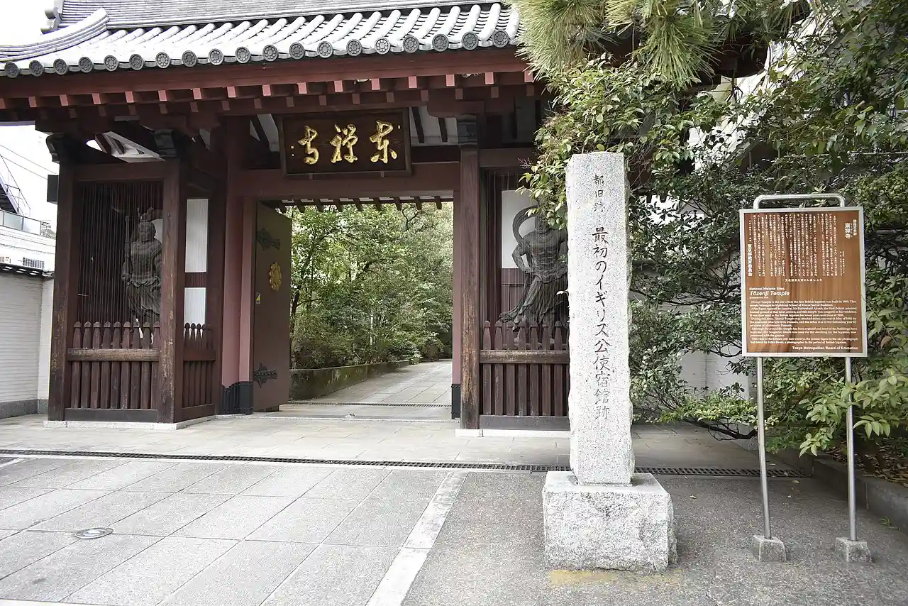 , is a Buddhist temple located in Takanawa, Minato, Tokyo, Japan. The temple belongs to the Myōshin-ji branch of the Rinzai school of Japanese Zen.Cortazzi, Hugh. (2000). Collected Writings of Sir Hugh Cortazzi, Vol. II, pp. 210-211. One of the four great Zen temples of Edo, it is best known in history as the location of the first British legation in Japan during the Bakumatsu period and the site of a number of incidents against foreigners by pro-sonnō jōi samurai. The temple's precincts were designated a National Historic Site in 2010. Read more on Wikipedia