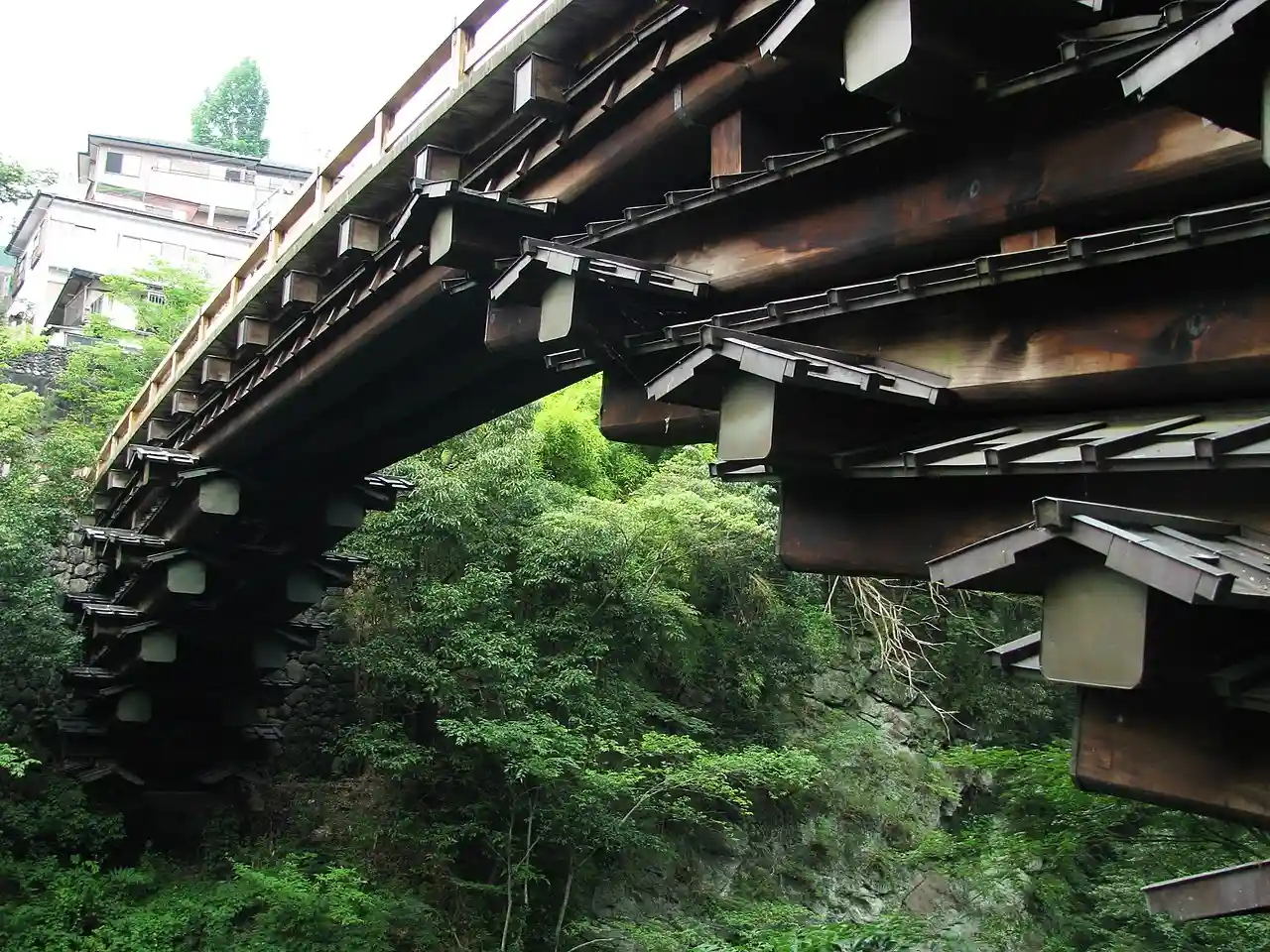 The Saruhashi Bridge (猿橋) is a historic arch bridge officially listed as a Place of Scenic Beauty of Japan in Ōtsuki, Yamanashi Prefecture. It is ranked as one of Japan's three unique bridges, along with the Kintai Bridge and the Shinkyo Bridge. It is also referred to as the monkey bridge Read more on Wikipedia