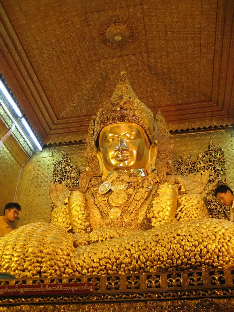 The Mahamuni Buddha Temple (, ) is a Buddhist temple and major pilgrimage site, located southwest of Mandalay, Myanmar (Burma). The Mahamuni Image () is enshrined in this temple, and originally came from Arakan. It is highly venerated in Burma and central to many people's lives, as it is seen as an expression of representing the Buddha's life.Johnston, p.1351 Read more on Wikipedia
