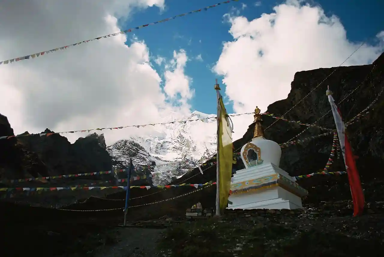 Milarepa Cave or Milerepa Cave is a cave associated with Milarepa in Nepal on the Annapurna Circuit at approximately just outside Manang. It is credited to have been the residence of the famous Tibetan Buddhism siddha Milarepa during his stay in 11th century in what is now modern-day northern Nepal. This site also includes a holy spring and a gompa. The cave is located beyond the gompa, with locals praying from the edge of a glacial moraine in direct line of sight of the cave as its approach is on a steep scree slope. Read more on Wikipedia