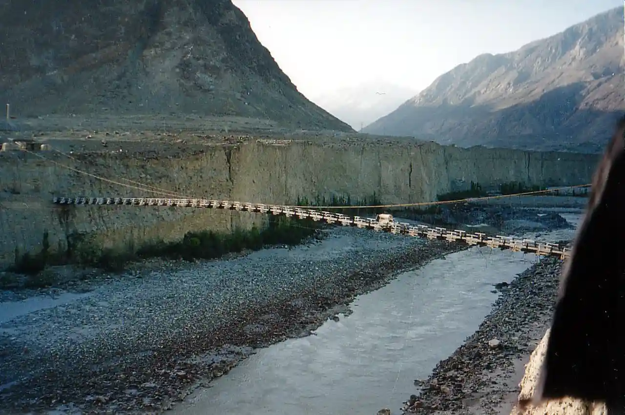 The Danyore Suspension Bridge is in the Gilgit-Baltistan region of Pakistan, and is one of the oldest makeshift suspension bridges in the region. The bridge connects Danyor to the premises of the Karakoram University across the River Hunza. Currently the bridge is closed for vehicles; only pedestrians and motorcyclists are allowed to pass through. Winds coming from northwest of the valley set the suspension bridge to swing inducing minute resonances, and it is therefore declared unsafe for normal traffic.Declared unsafe: Danyore Bridge closed to traffic In 2013 a two-way concrete bridge was constructed beside it that is being used as an alternative.Danyore Suspension Bridge and Tunnel It connects Gilgit City the region of District Read more on Wikipedia