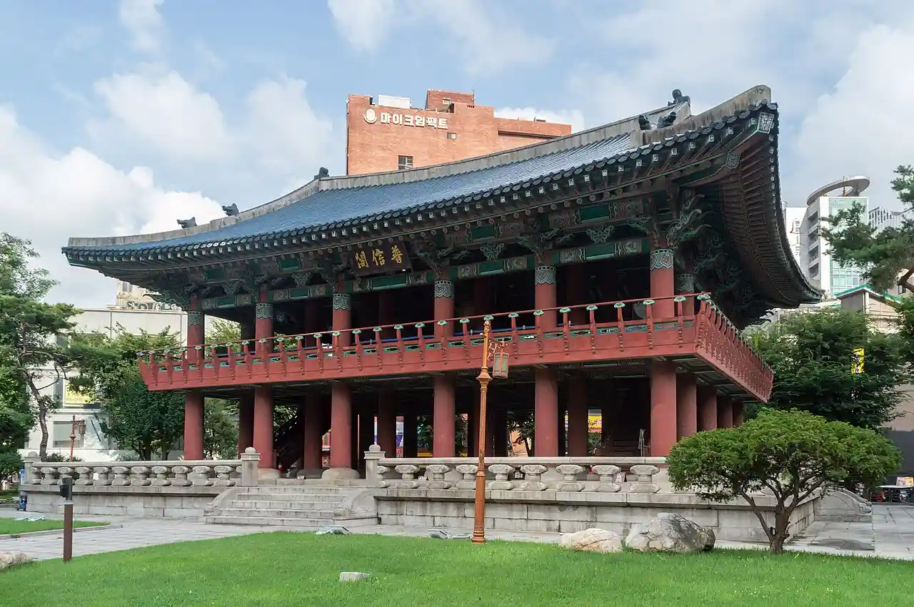 Bosingak () is a large bell pavilion on Jongno in Seoul, South Korea. The bell in Bosingak gives Jongno its name, which translates to "bell street". It was originally constructed in 1396 but destroyed many times by both war and fire. It was designated Bosingak by Emperor Gojong in 1895. Read more on Wikipedia