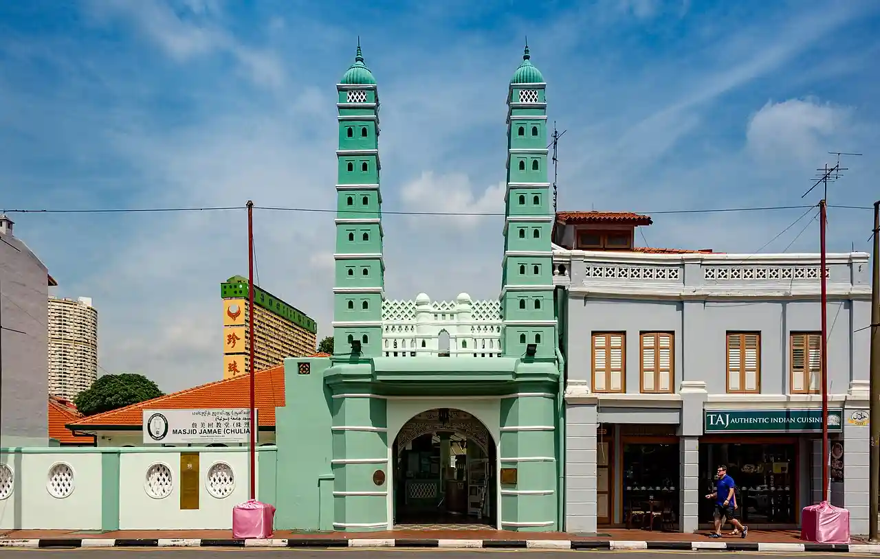 Jamae Mosque is one of the earliest mosques in Singapore, and is located on South Bridge Road in the Chinatown district within the Central Area. The mosque was established in 1826. This mosque is also known as Chulia Mosque and among the Tamil Muslim community in Singapore. Together with its neighbour, Sri Mariamman Temple, the mosque stands out in its predominantly Chinese location. The Mosque Street that runs beside it may have been named after this mosque. Read more on Wikipedia