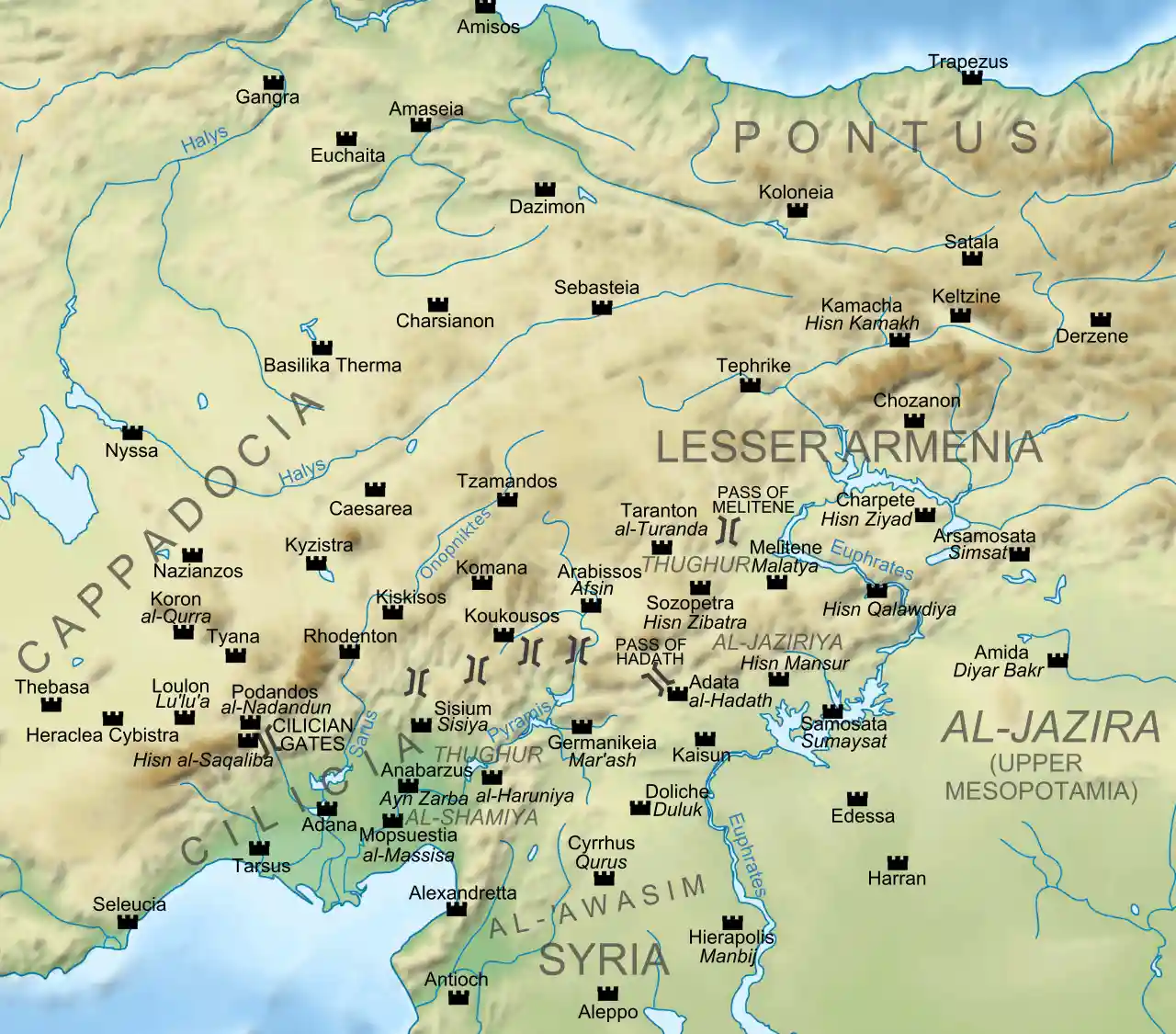 Al-Ḥadath al-Ḥamrā' (Arabic for "Hadath the Red") or Adata () was a town and fortress near the Taurus Mountains (modern southeastern Turkey), which played an important role in the Byzantine–Arab Wars. Read more on Wikipedia