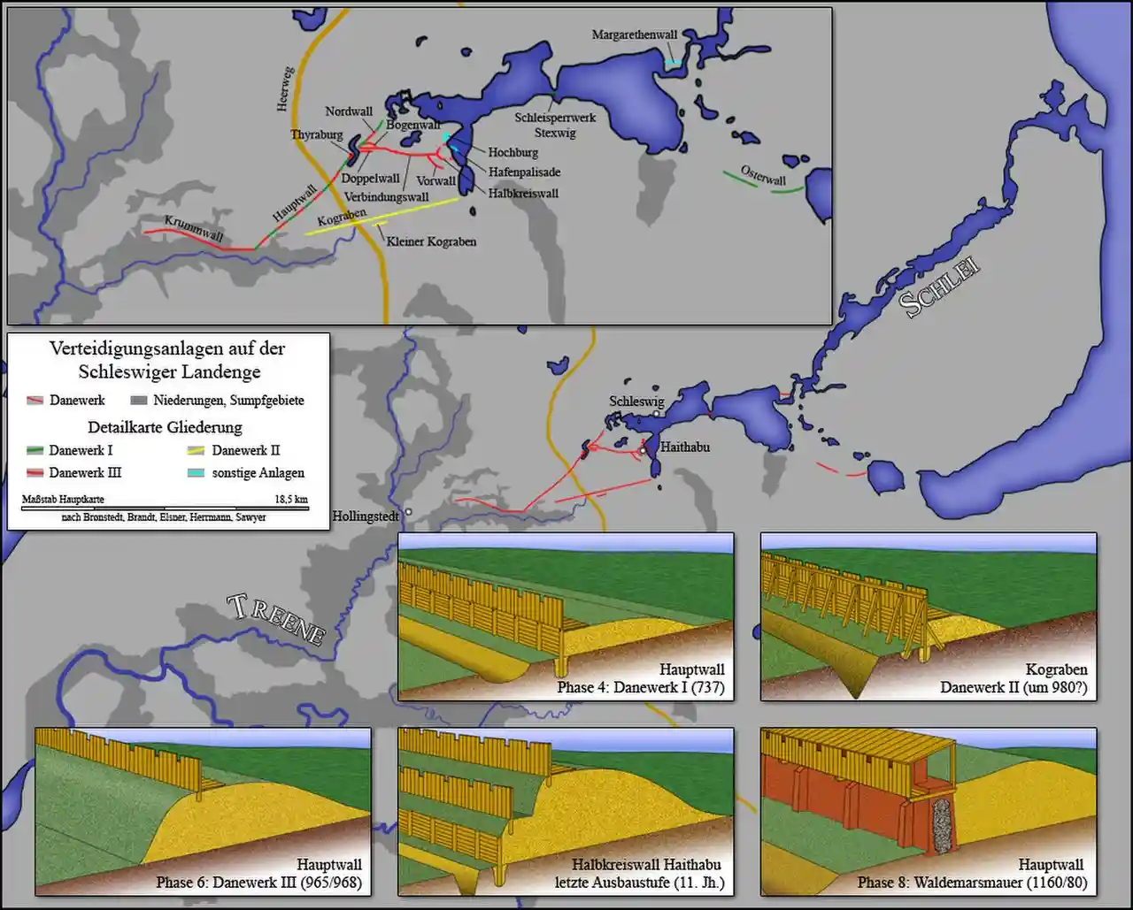 The Danevirke or Danework (modern Danish spelling: Dannevirke; in Old Norse; Danavirki, in German; Danewerk, literally meaning earthwork of the DanesOrdbog over det danske Sprog: Virke) is a system of Danish fortifications in Schleswig-Holstein, Germany. This historically important linear defensive earthwork across the neck of the Cimbrian peninsula was initiated by the Danes in the Nordic Iron Age about AD 650. It was later expanded multiple times during Denmark's Viking Age and High Middle Ages. The Danevirke was last used for military purposes in 1864 during the Second War of Schleswig. Read more on Wikipedia