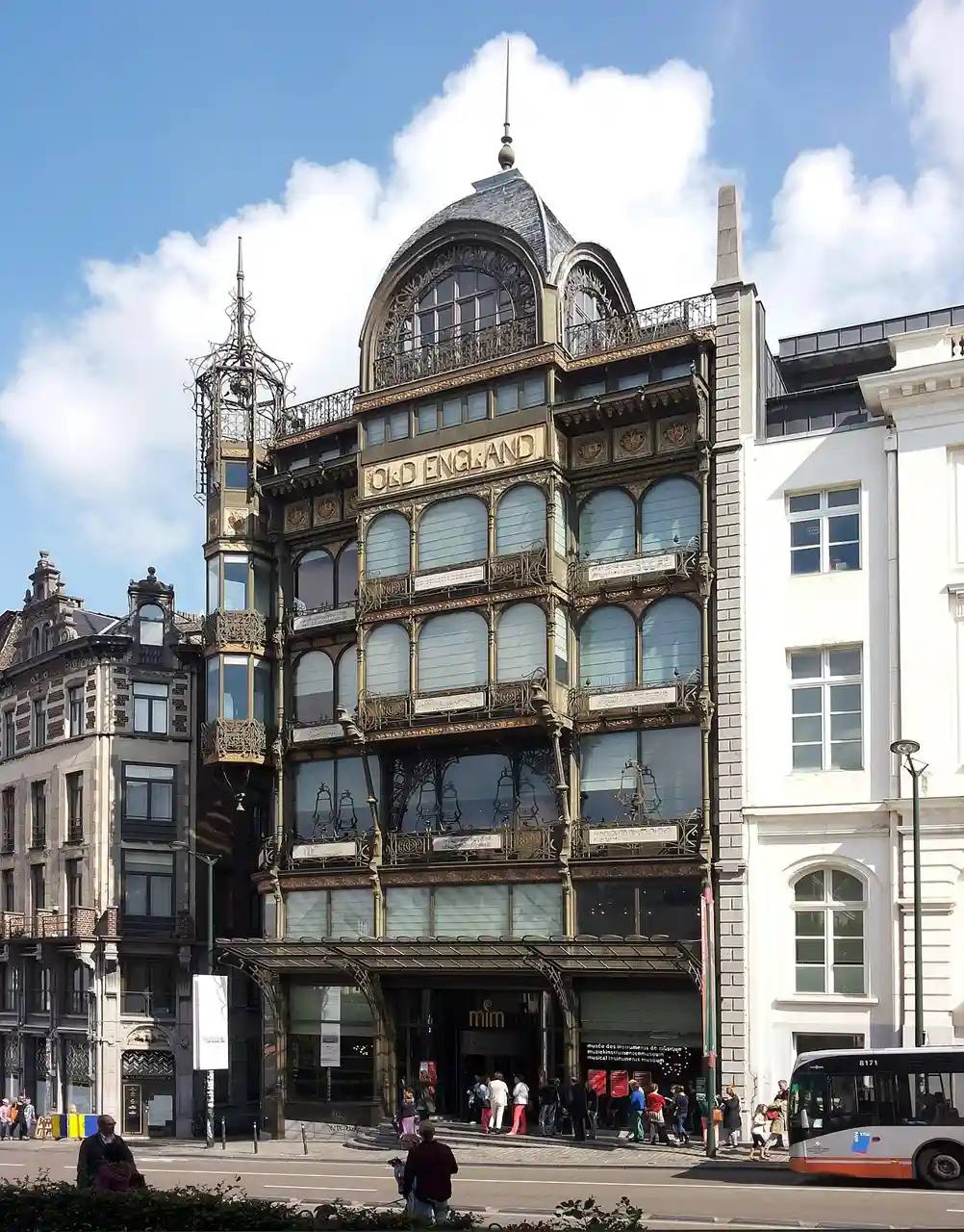 The Old England department store was a large retailer in central Brussels, Belgium, partially housed in a notable Art Nouveau building constructed in 1899 by Paul Saintenoy out of girded steel and glass. Nowadays, its former buildings house the Musical Instruments Museum (MIM), founded in 1877, which forms part of the group of Royal Museums for Art and History (RMAH). Read more on Wikipedia