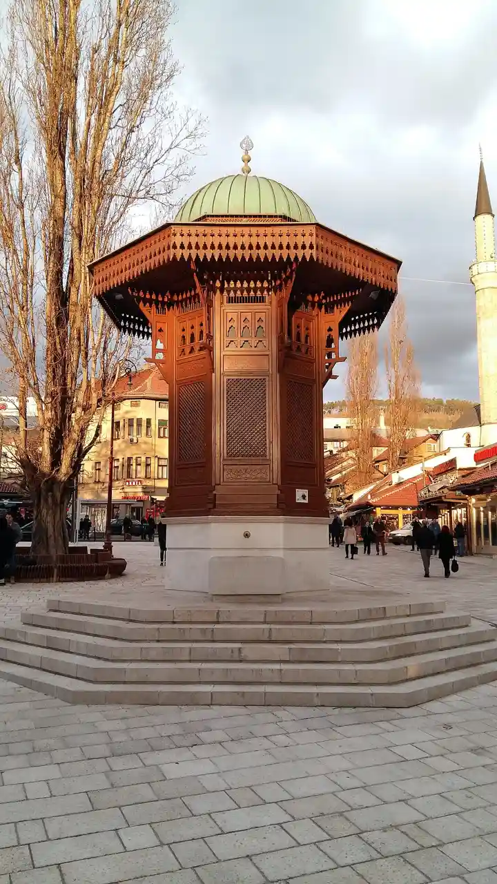 The Sebilj is an Ottoman-style wooden fountain (sebil) in the centre of Baščaršija Square in Sarajevo built by Mehmed Pasha Kukavica in 1753. It was relocated by Austrian architect Alexander Wittek in 1891. According to local legend, visitors who drink water from this fountain will return to Sarajevo someday. Read more on Wikipedia