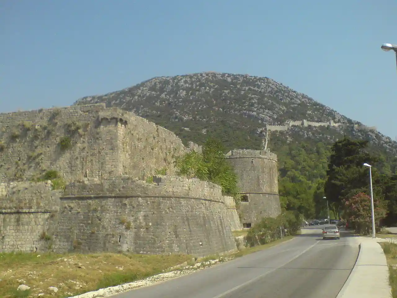The Walls of Ston () are a series of defensive stone walls, originally more than long, that surrounded and protected the city of Ston, in Dalmatia, part of the Republic of Ragusa, in what is now southern Croatia. Their construction was begun in 1358. On the Field Gate of the Walls () there is a Latin inscription which dates from 1506. Today, it is one of the longest preserved fortification systems in the world.Stonske zidine, među najdužim su sačuvanim fortifikacijskim sustavima Read more on Wikipedia