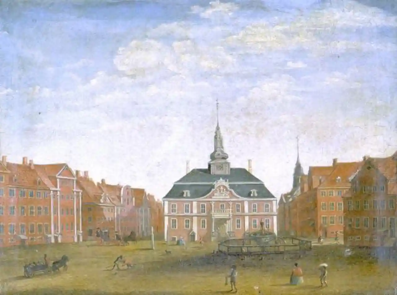 A new, fourth City Hall in Copenhagen, Denmark, was built between Gammeltorv and Nytorv in 1728 on the foundations of its predecessor which had been destroyed in the first Great Fire of Copenhagen earlier that same year. In 1795 it was itself destroyed in the second Great Fire of Copenhagen and later replaced by the new combined city hall and courthouse at Nytorv which was completed in 1815. Read more on Wikipedia