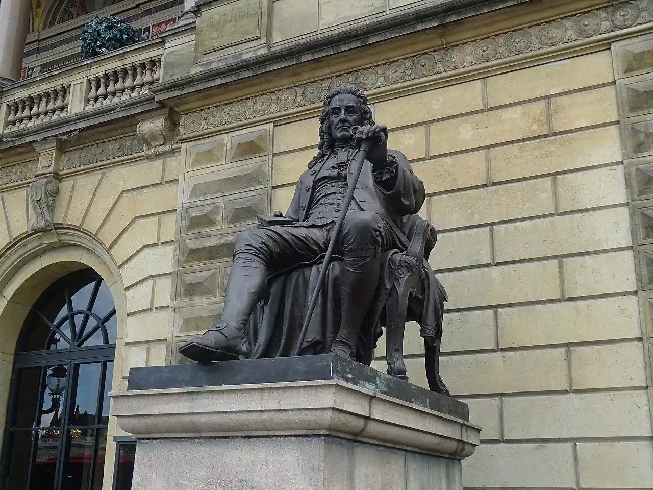 The statue of Ludvig Holberg by Theobald Stein is together with Herman Wilhelm Bissen's statue of Adam Oehlenschläger flanking the main entrance to the Royal Danish Theatre on Kongens Nytorv in Copenhagen, Denmark. It was created by Stein in conjunction with the inauguration of Vilhelm Dahlerup's new theatre building in 1875. Bissen's statue of Oehlenschläger is from 1861 and was originally located on Sankt Annæ Plads. Read more on Wikipedia