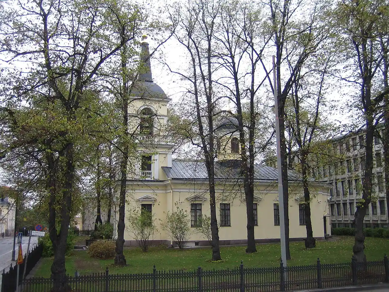The Holy Trinity Church (, , ) is a Finnish Orthodox Church located in the Kruununhaka district of Helsinki, on the corner of Unioninkatu and Rauhankatu. The church was built in the neo-classical style in 1826 under the direction of the architect Carl Ludvig Engel, and was dedicated and opened in the following year.Holy Trinity Church, Helsinki The Holy Trinity services the city's orthodox community with Divine Liturgy held in both Church Slavic and Finnish. Read more on Wikipedia