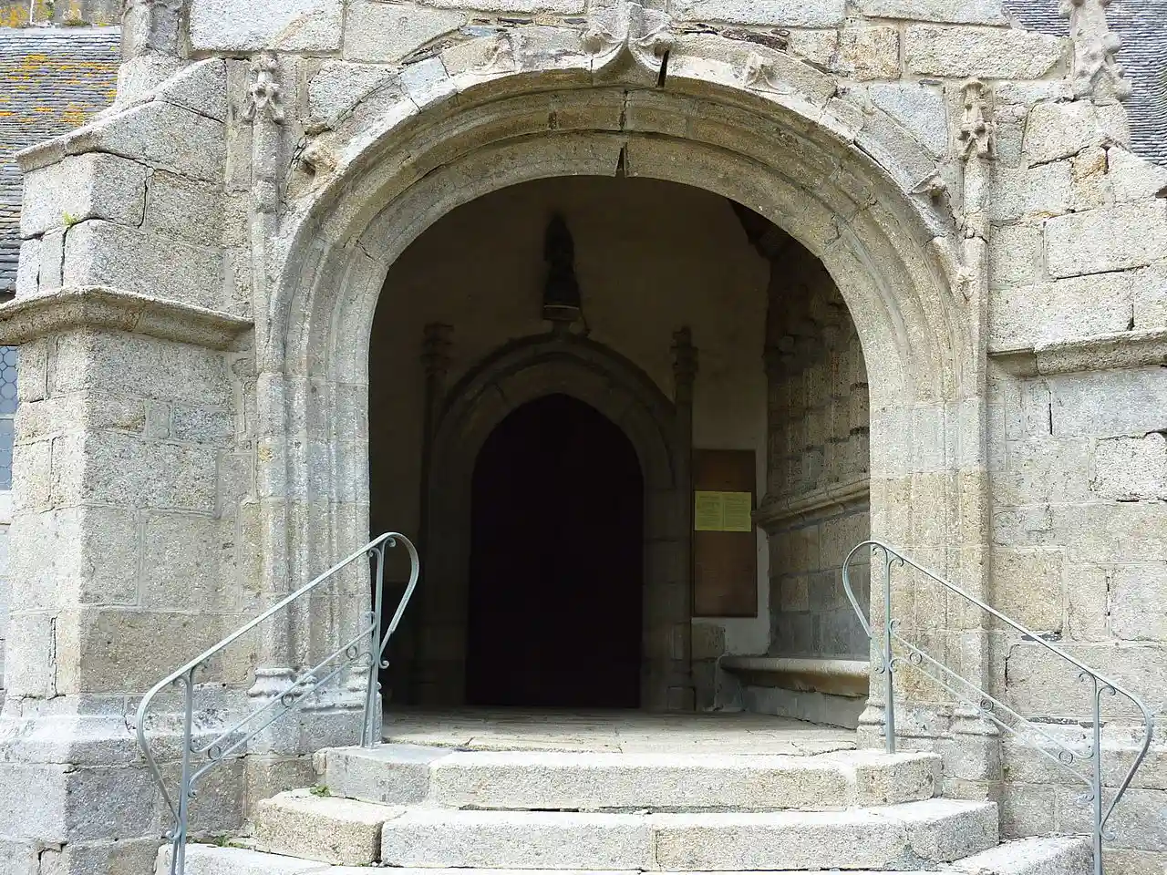 The Église Sainte-Geneviève de Loqueffret is a Roman Catholic parish church located at Loqueffret, situated in the arrondissement of Châteaulin and the department of Finistère in Brittany in north-western France. The parish church of Loqueffret was built in granite in the Gothic style in the 16th century and is dedicated to Saint Geneviève, a 10th-century Breton saint. The calvary dates to the 15th century. The existing bell-tower dates to 1771 and the bell-tower spire was designed by the architect Joseph Bigot and dates to 1850. The church has two large entrances on the west and south side. Read more on Wikipedia