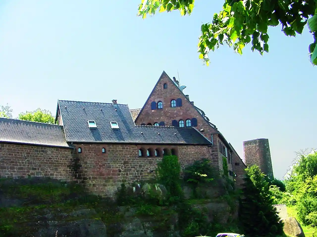Château de Hunebourg ( or Hünenburg) is a rock castle that lies to the west of Neuwiller-lès-Saverne in the French département of Bas-Rhin on a 425-metre-high sandstone rock outcrop. It is accessible from the valley of the Zinsel du Nord. The original castle was built in the 12th-13th century, but very little remains from this period. The castle was reconstructed in a neo-romanesque style in the 1930s. It is a listed historical monument since 2007. Château fort de Hunebourg Read more on Wikipedia