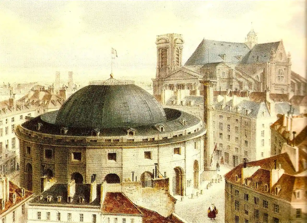 The Halle aux blés (Wheats Exchange or Grains Exchange) was a circular building in central Paris used by grain traders built in 1763–1767, with an open-air interior court that was capped by a wooden dome in 1783, then by an iron dome in 1811. In a major reconstruction in 1888–1889 much of the structure was replaced and the building became the Bourse de commerce. Read more on Wikipedia