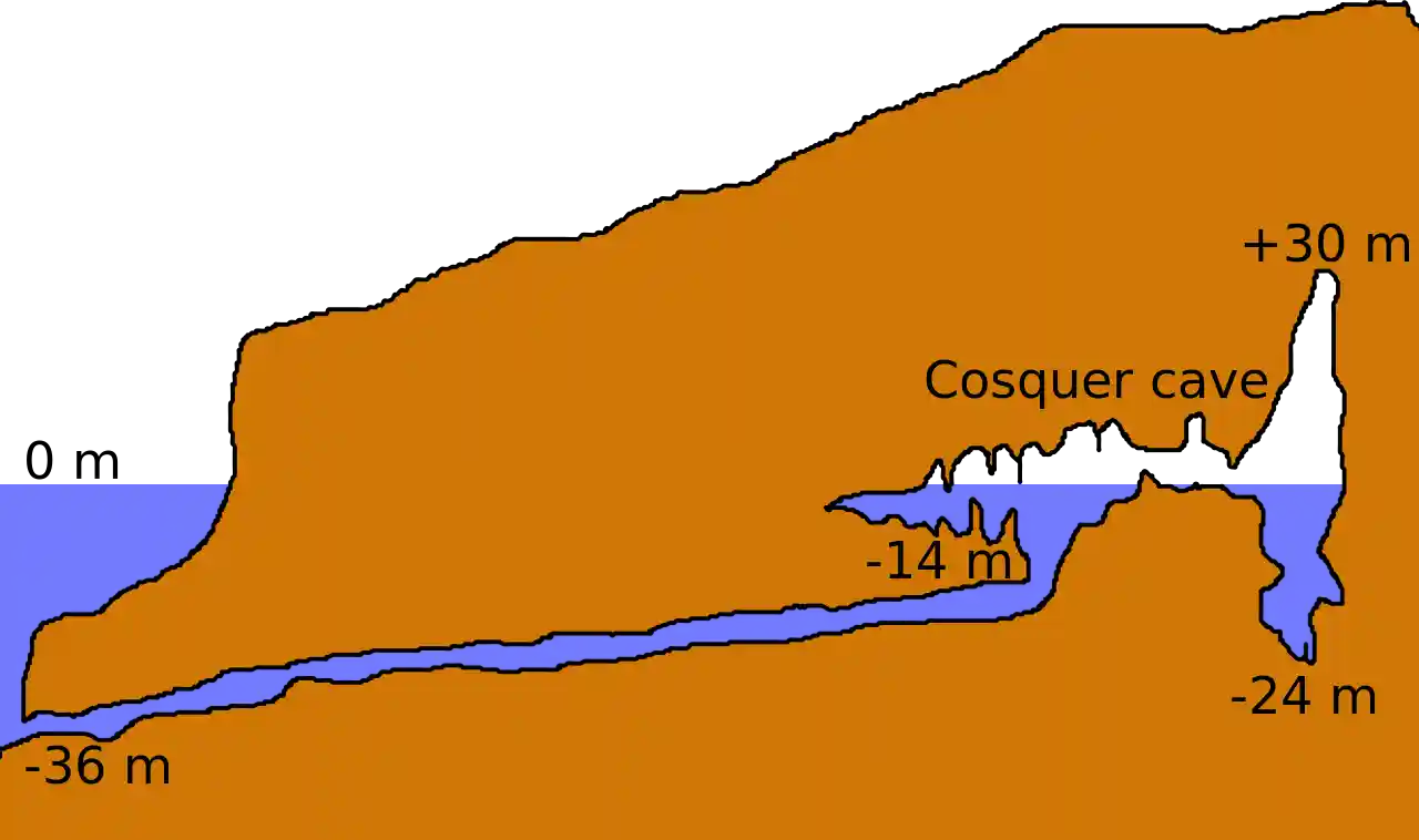 The Cosquer Cave is located in the Calanque de Morgiou in Marseille, France, near Cap Morgiou. The entrance to the cave is located underwater, due to the Holocene sea level rise. The cave contains various prehistoric rock art engravings. Its submarine entrance was discovered in 1985 by Henri Cosquer, a professional diver. The underwater passage leading to the cave was progressively explored until 1990 by cave divers without the divers being aware of the archaeological character of the cave. It is only in the last period (1990-1991) of the progressive underwater explorations that the cave divers emerged in the non-submerged part of the cave. The prehistoric paintings were not immediately discovered by the divers to first emerge from the other side of the sump. The cave was named after Henri Cosquer, when its existence was made public in 1991, after three divers became lost in the cave and died. Read more on Wikipedia