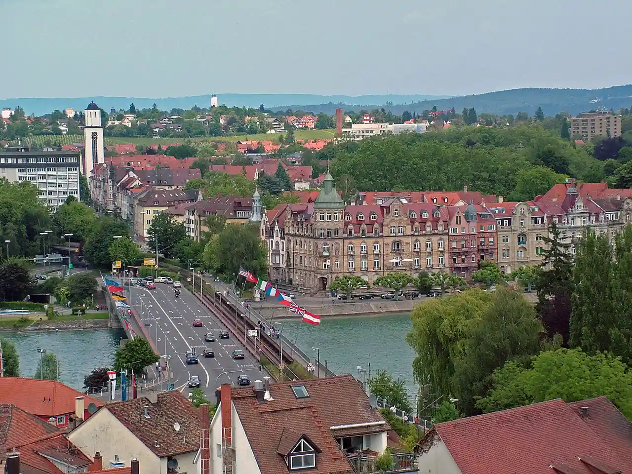 The Old Rhine Bridge at Konstanz spans the Seerhein. It is a combined road and railway bridge. In addition to one track of the High Rhine Railway at kilometer 413.5, it carries the , the road that connects the borough of Petershausen with the city centre. The road bridge carries two lanes into the city center and three lanes in the other direction. Additionally, there is a bicycle lane in both directions on the left (as seen from the city centre) and a sidewalk on the right. In the 19th century, distance markers were placed along the Rhine; they start counting kilometers at this bridge. Read more on Wikipedia