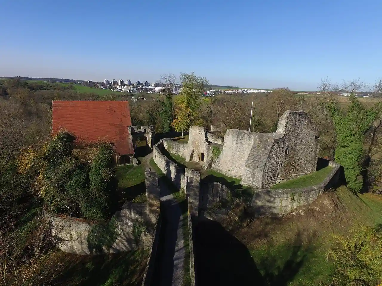 Nippenburg, both the ruined castle built on a mountain spur overlooking the Glems river valley and the farming village it was constructed in, is located and from Stuttgart's city center near the town of Schwieberdingen. The oldest record of Nippenburg's existence is from the Codex Hirsaugiensis of 1160, making it among the oldest castles in the vicinity of Stuttgart. Today, all that remains of the castle is the high curtain wall and outer bailey and a large barn built in 1483, thanks to a short-lived effort in the early 1980s to restore these structures. Read more on Wikipedia