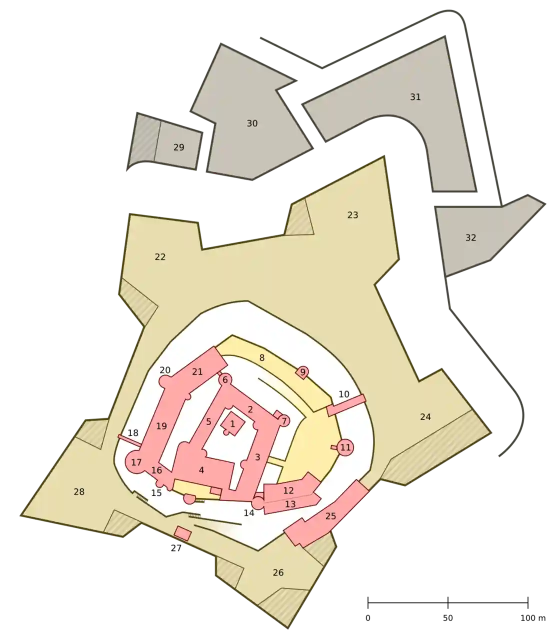 Rosenberg Fortress (German: Festung Rosenberg) is a fortress situated on a hill overlooking Kronach, a town in the Upper Franconia region of Bavaria, Germany. It is one of the largest, best-preserved, and most complete fortresses in Bavaria. Tracing its origins back to the 13th century, the fortress was never captured by violent means. Originating as a medieval hill castle, it was transformed into a massive baroque fortress complex during the early modern period, being one of the two fortresses of the Prince-Bishopric of Bamberg (the other one being the now-defunct Forchheim Fortress). With countless construction stages representing centuries of architectural development visible, Rosenberg Fortress serves as an outstanding example of the evolution of defensive architecture in Germany. Including its moats and ravelins, the fortress covers an area of circa 8.5 hectares (19.8 acres). Read more on Wikipedia
