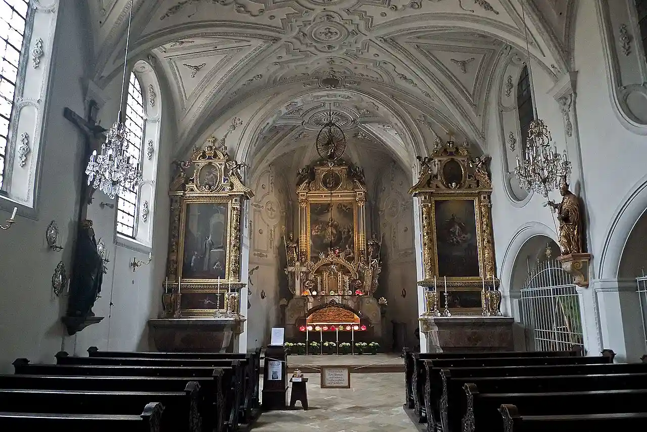 St. Sylvester is a Catholic church and parish in Schwabing, now part of Munich, in the German state (Bundesland) of Bavaria. It began with a village church in the 14th century, first documented in 1315, and dedicated to John the Baptist. A Gothic church was remodelled in Baroque style in the 17th century, and received furnishings such as sculpture attributed to Ignaz Günther or his school. Read more on Wikipedia