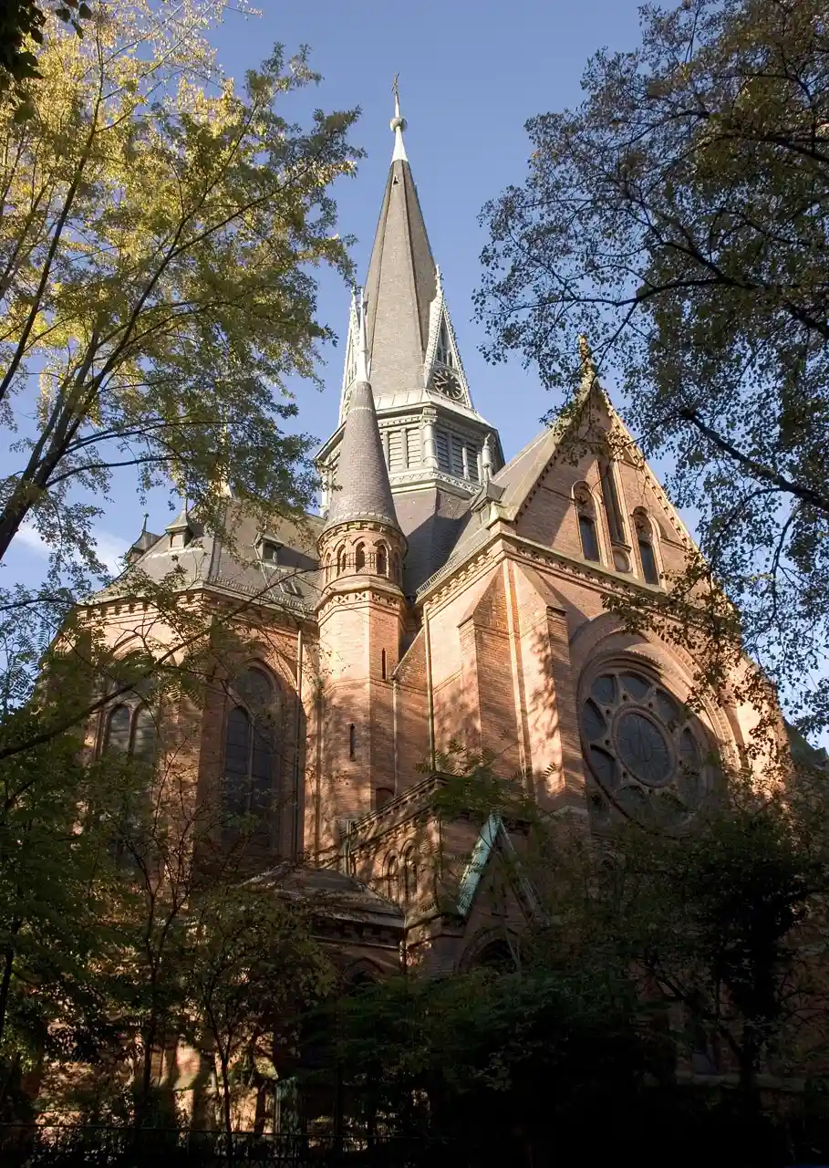 The Bergkirche (Mountain Church) is one of four main Protestant churches in Wiesbaden, the capital of Hesse, Germany. It was completed in 1879 in Gothic Revival based on a design by Johannes Otzen. The church is focused on having the altar and pulpit close to the congregation, following Luther's concept of a universal priesthood. It also serves as a concert venue for church music. Read more on Wikipedia