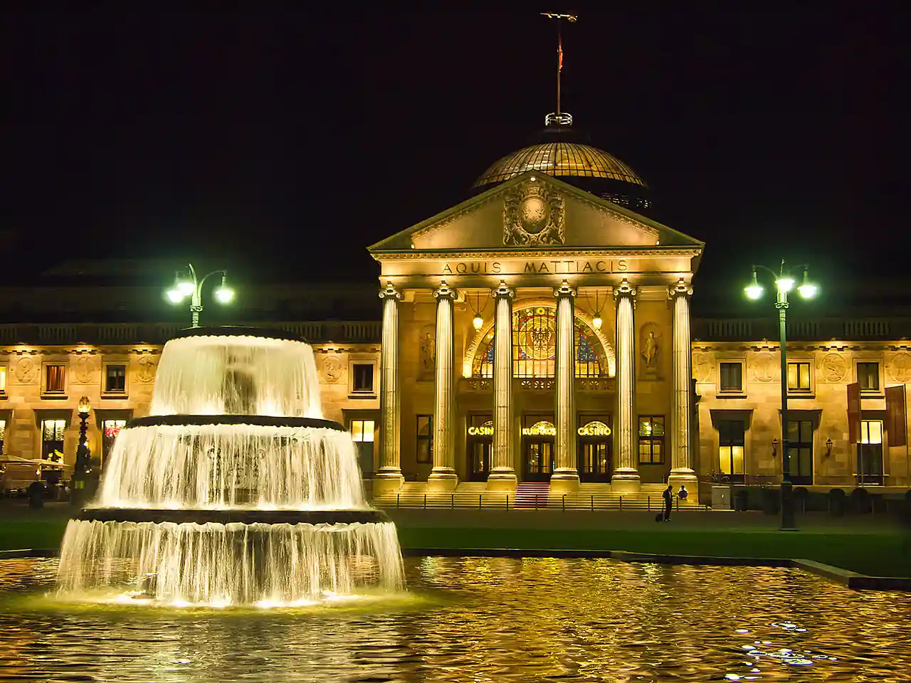 The Kurhaus ("cure house", ) is the spa house in Wiesbaden, the capital of Hesse, Germany. It serves as the city's convention centre, and the social center of the spa town. In addition to a large and a smaller hall, it houses a restaurant and the Wiesbaden Casino, or Spielbank, which is notable for allowing the "highest roulette stakes in Germany" (), and where Fyodor Dostoyevsky was said to have received the inspiration for his novel The Gambler. Read more on Wikipedia