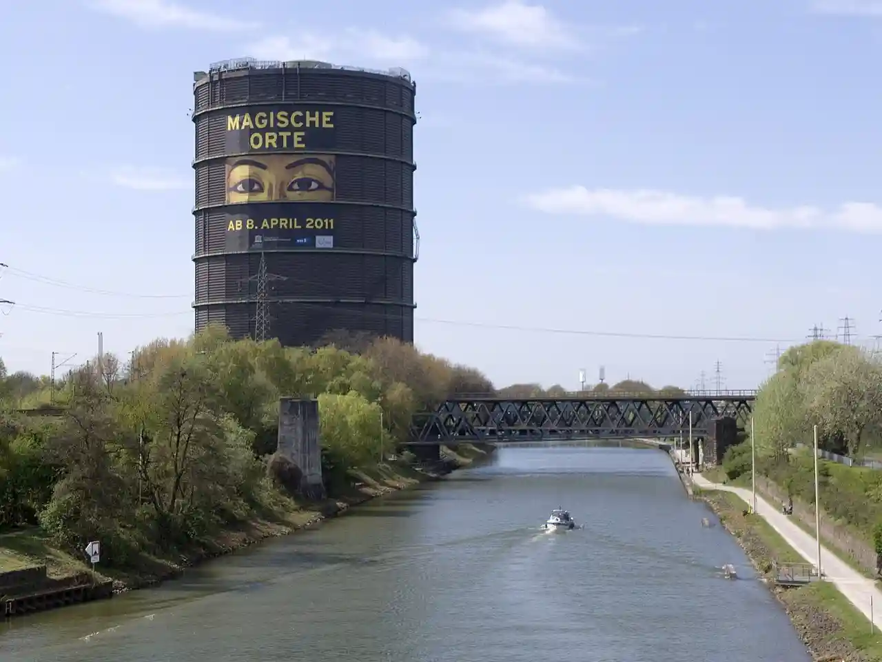The Gasometer Oberhausen is a former gas holder in Oberhausen, Germany, which has been converted into an exhibition space. It has hosted several large scale exhibitions, including two by Christo and Jeanne-Claude. The Gasometer is an industrial landmark, and an anchor point of the European Route of Industrial Heritage and the Industrial Heritage Trail. It was built in the 1920s, and reconstructed after World War II. Read more on Wikipedia