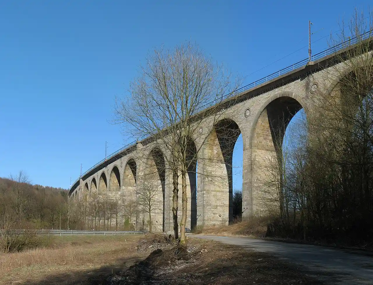 The Altenbeken Viaduct (, also known as Bekeviadukt or Großer Viadukt Altenbeken) is a long and up to high double track limestone railway viaduct. It spans the Beke valley, west of the town of Altenbeken, in the Land of North Rhine-Westphalia, Germany. Read more on Wikipedia