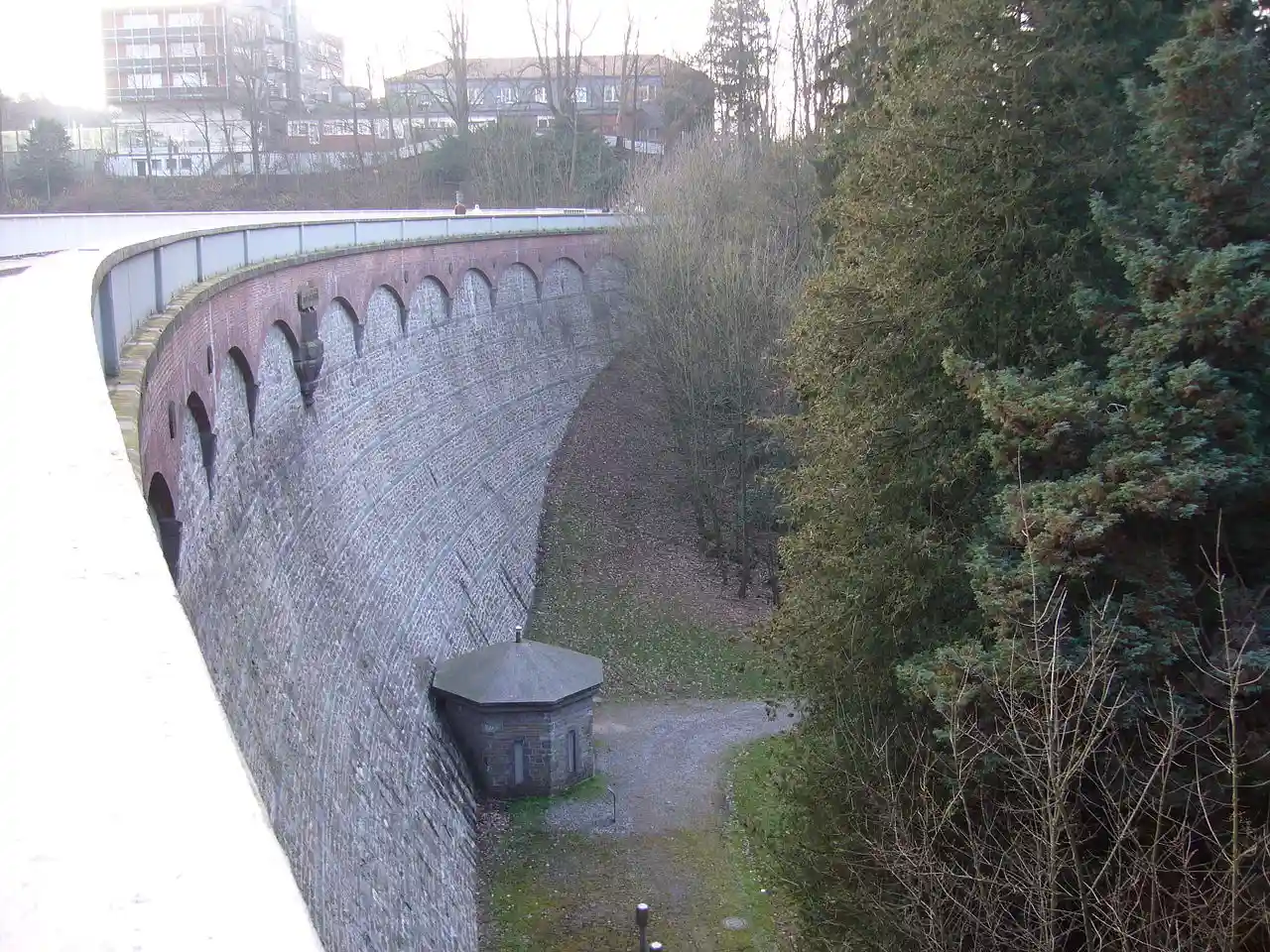 The Eschbach Dam () was the first dam to be built in Germany for drinking water supply. It is located in Remscheid, North Rhine-Westphalia, Germany. With its opening in 1891, this pioneer work of hydraulic engineering was a milestone in the economic development of the city of Remscheid. Read more on Wikipedia
