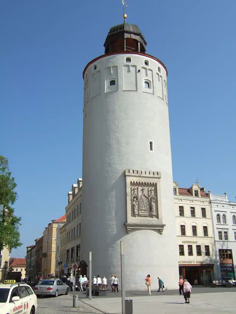 The Thick Tower (, ) erected in 1250 is part of the historic fortification of Görlitz. The tall tower is the most massive tower in the city. Its walls in the lower part reach a thickness of , thus the name of a thick tower. Apart from it, the Nikolai Tower and the Reichenbach Tower are still preserved. In total, Görlitz had four large watchtowers and defense towers. Read more on Wikipedia