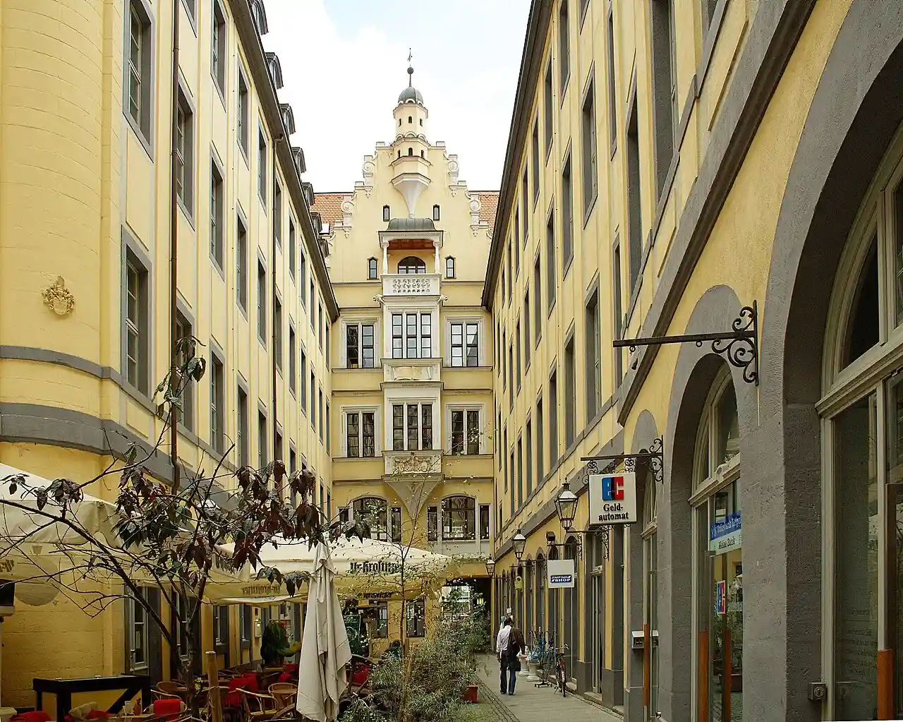 Barthels Hof is a former trade court building complex in Leipzig in Germany, located in the borough Mitte. It is the last “through courtyard” that was preserved almost in its original condition. That means, the carts drove in, the goods were unloaded, and the carts drove out - without turning around. The horses were stabled in the suburbs. Later, from 1893 on, only samples of the goods were shown in the trade fairs and made to order. The Barthels Hof stretches from the market square to Kleine Fleischergasse and is now one of the city's most important sights. Today, it is used for a restaurant and some small shops. Read more on Wikipedia