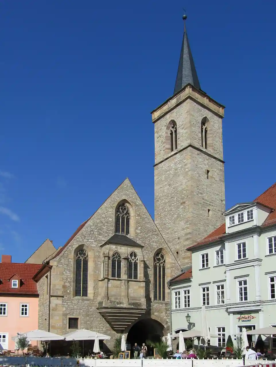 St Giles' Church (, also St. Ägidii) in the historical centre of the city of Erfurt in Thuringia, Germany, forms the eastern entrance from Wenigemarkt (Minor Market) to the Krämerbrücke (Merchants' Bridge) with its archway. The single-nave Gothic church building is one of the former two bridgehead churches. At the western end stood the Benediktikirche (St Benedict's Church) since the 11th century, which was demolished in 1890 and is now only remembered by the name of Benediktsplatz (St Benedict's Square). Read more on Wikipedia