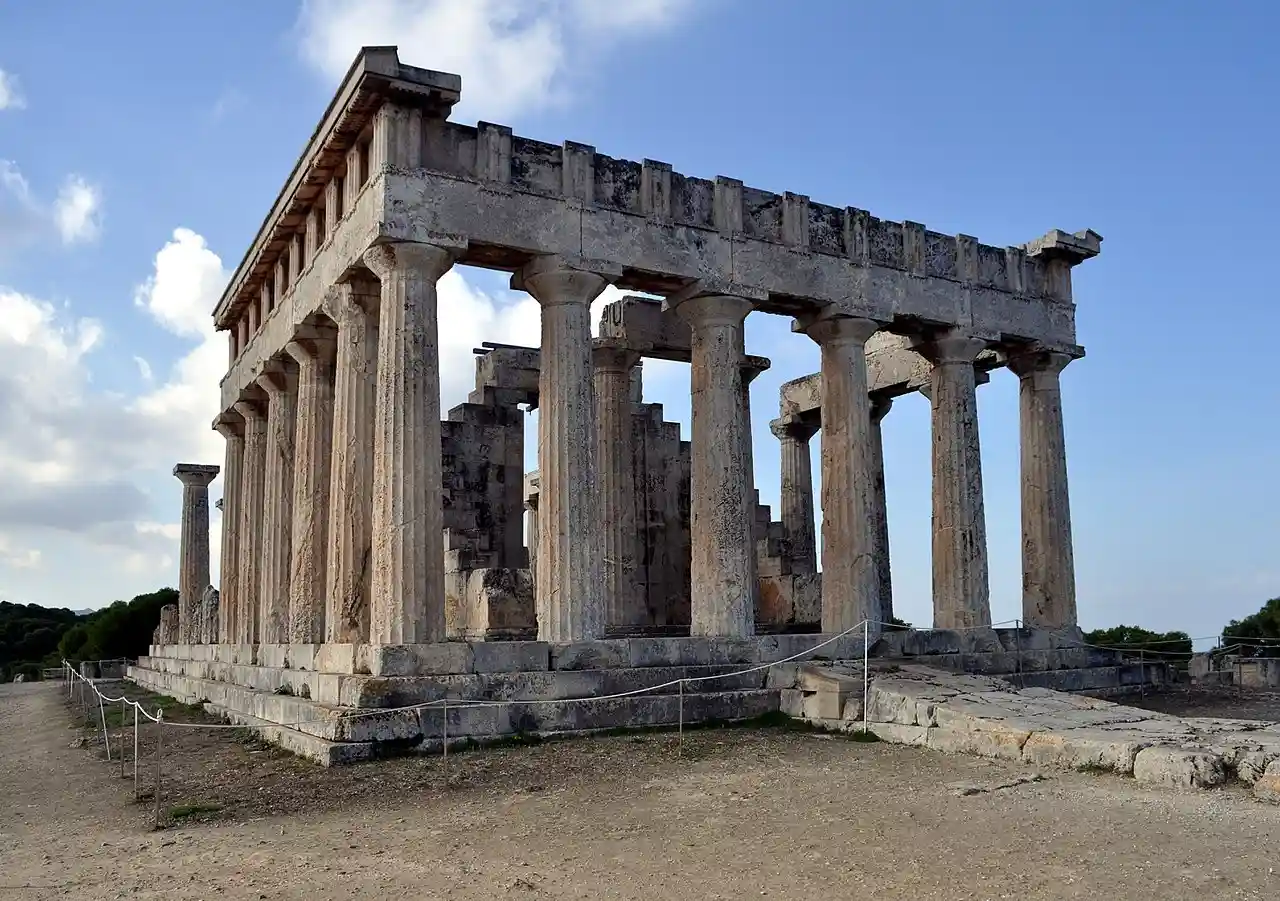 The Temple of Aphaia () or AfeaThe name Afea appears on all the local signs, Afea being the name of a Cretan woman of unsurpassed beauty. After escaping an unwelcome marriage on Crete, she was rescued by a fisherman from Aegina. In payment for this he also proposed an unwelcome marriage. So Afea headed out of Aghia Marina towards the mountain top where she vanished at the current site of the temple, where it is said that the fisherman established a shrine believing Afea to have been taken by the gods. is an Ancient Greek temple located within a sanctuary complex dedicated to the goddess Aphaia on the island of Aegina, which lies in the Saronic Gulf. Formerly known as the Temple of Jupiter Panhellenius, the Doric temple is now recognized as having been dedicated to the mother-goddess Aphaia. It was a favourite of Neoclassical and Romantic artists such as J. M. W. Turner. It stands on a c. 160 m peak on the eastern side of the island approximately 13 km east by road from the main port.The main port and the main city are named Aegina, after the island. The Temple of Aphaia is 9.6 km east of this city. The sanctuary is also 29.5 km southwest of the Acropolis of Athens, which is visible across the gulf on a clear day. Read more on Wikipedia