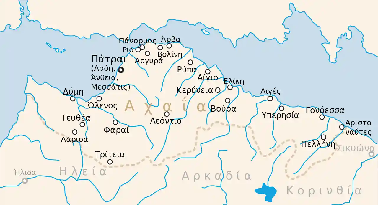 Helike (; , pronounced , modern ) was an ancient Greek polis (city-state) that was submerged by a tsunami in the winter of 373 BC. It was located in the regional unit of Achaea, northern Peloponnesos, two kilometres (12 stadia) from the Corinthian Gulf and near the city of Boura, which, like Helike, was a member of the Achaean League. Modern research attributes the catastrophe to an earthquake and accompanying tsunami which destroyed and submerged the city. In an effort to protect the site from destruction, the World Monuments Fund included Helike in its 2004 and 2006 List of 100 Most Endangered Sites. Read more on Wikipedia