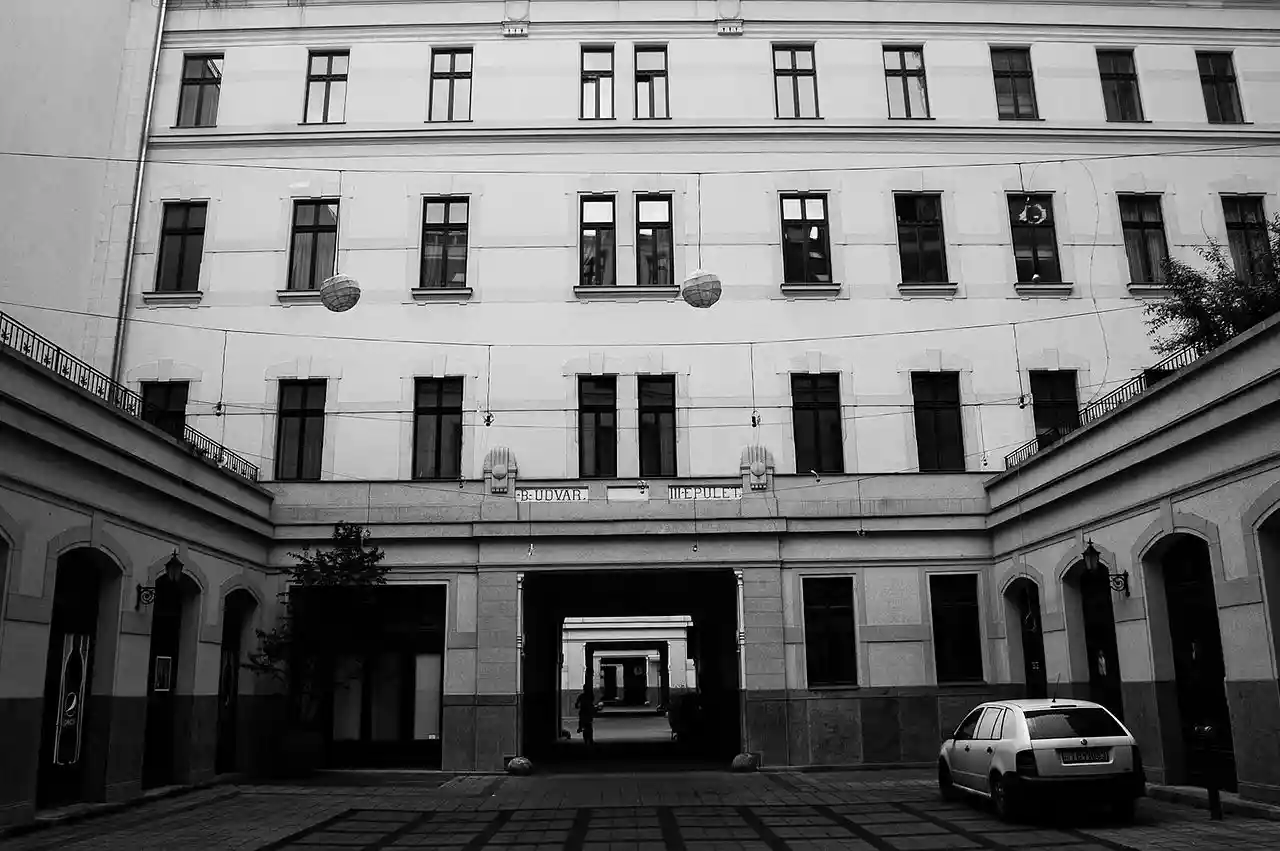 Gozsdu-udvar (English: Gozsdu Courtyard) comprises seven buildings and their courtyards in the 7th district of Budapest, and can be approached from Király Street, Dob Street and Holló Street. The building complex was built in 1901 by the Gozsdu Foundation according to the testament of the Romanian lawyer, Emanoil Gojdu (). Read more on Wikipedia