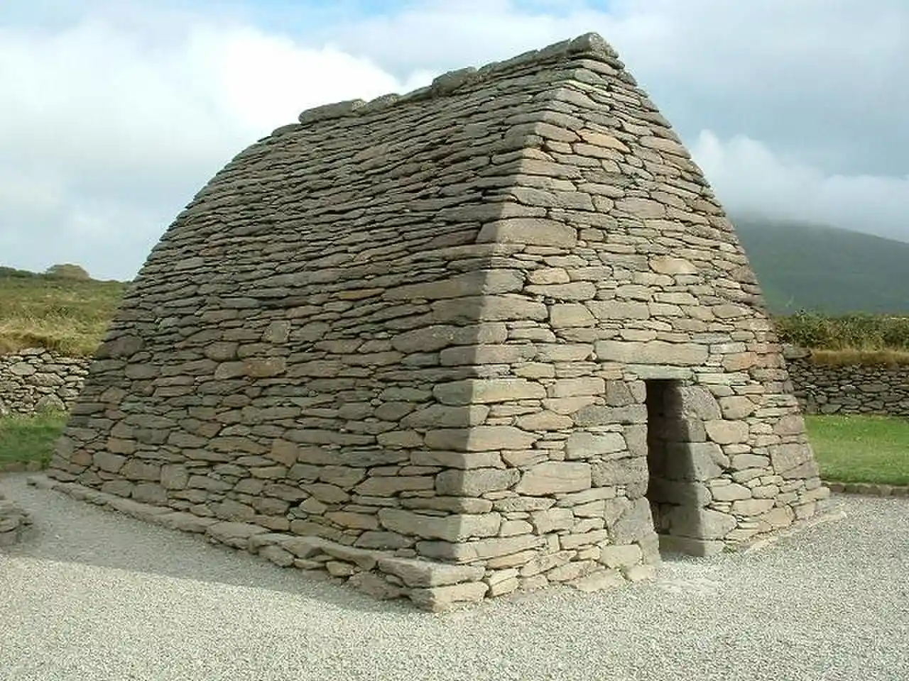 The Gallarus Oratory (, Gallarus being interpreted as either 'rocky headland' (Gall-iorrus) or 'house or shelter for foreigner(s)' (Gall Aras) is a chapel on the Dingle Peninsula, County Kerry, Ireland. It has been presented variously as an early-Christian stone church by antiquary Charles Smith, in 1756; a 12th-century Romanesque church by archaeologist Peter Harbison in 1970; a shelter for pilgrims by the same in 1994. The local tradition prevalent at the time of Charles Smith attributed it to one Griffith More, being a funerary chapel built by him or his family at their burial place. Read more on Wikipedia