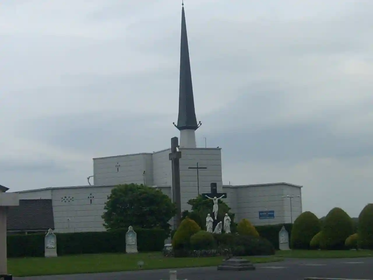 The Basilica of Our Lady, Queen of Ireland is a Roman Catholic Church of the Latin Rite located in the small town of Knock, in County Mayo in Ireland. It was designed in modern architecture style with concrete materials by architect Daithi Hanly, and completed in 1976. Its construction was overseen by Monsignor James Horan, who was the parish priest of Knock from 1967 until his death in 1986. Read more on Wikipedia