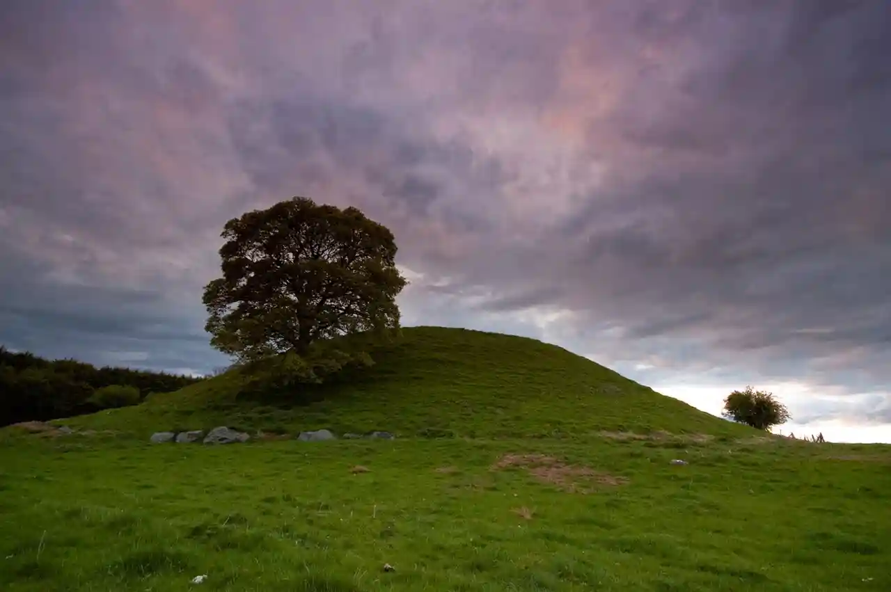 Dowth () is a Neolithic passage tomb near the River Boyne in County Meath, Ireland. It is one of the three main tombs of the Brú na Bóinne World Heritage Site, along with Newgrange and Knowth. Its features align it with the other passage tombs, which date from around 3200 BC. Unlike its bigger neighbours, Dowth has mostly been left as a ruin, although its smaller inner chambers are largely intact. The Royal Irish Academy carried out a botched excavation in 1847, leaving a large crater in the mound that has never been repaired. Read more on Wikipedia