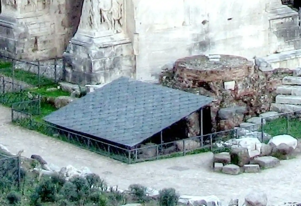 The altar of Saturn () is an archaic altar dedicated to the god Saturn. Constructed in the sixth century BCE, it continued to be used until the Roman Empire collapsed. It is located in front of the Temple of Saturn in the Roman Forum and its remains were uncovered by Rodolfo Lanciani in 1902. Read more on Wikipedia