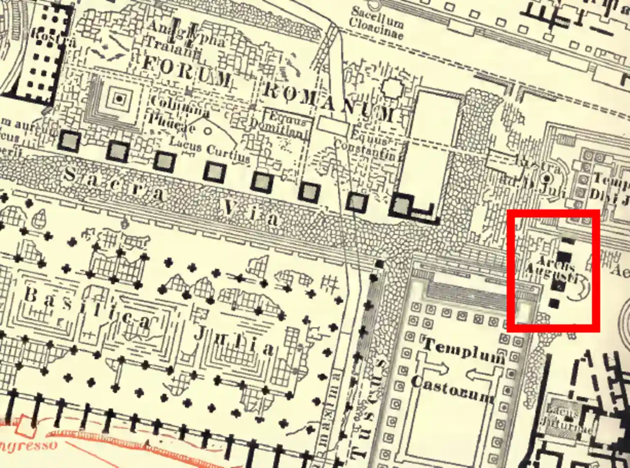 The Arch of Augustus (, ) was the triumphal arch of Augustus, located in the Roman Forum. It spanned the Via Sacra, between the Temple of Castor and Pollux and the Temple of Caesar, near the Temple of Vesta, closing off the eastern end of the Forum. It can be regarded as the first permanent three-bayed arch ever built in Rome.Holland, The Triple Arch of Augustus, p. 53. Read more on Wikipedia