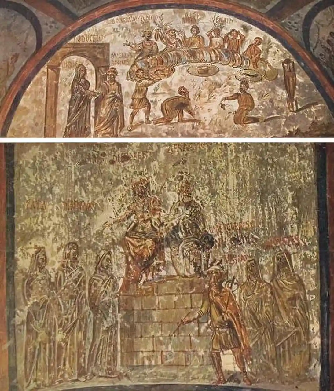 The Hypogeum of Vibia is part of a small complex of pagan burial chambers in Rome which were constructed along the Via Appia in the late 4th century CE. It is named for the burials of a woman named Vibia and her husband Vincentius, a priest of the Thraco-Phrygian god Sabazios. The hypogeum is notable for the paintings that show the deceased figures in mythological scenes and in the underworld, and for their accompanying inscriptions. Numerous other decorated tombs and inscriptions were found in the complex. Read more on Wikipedia
