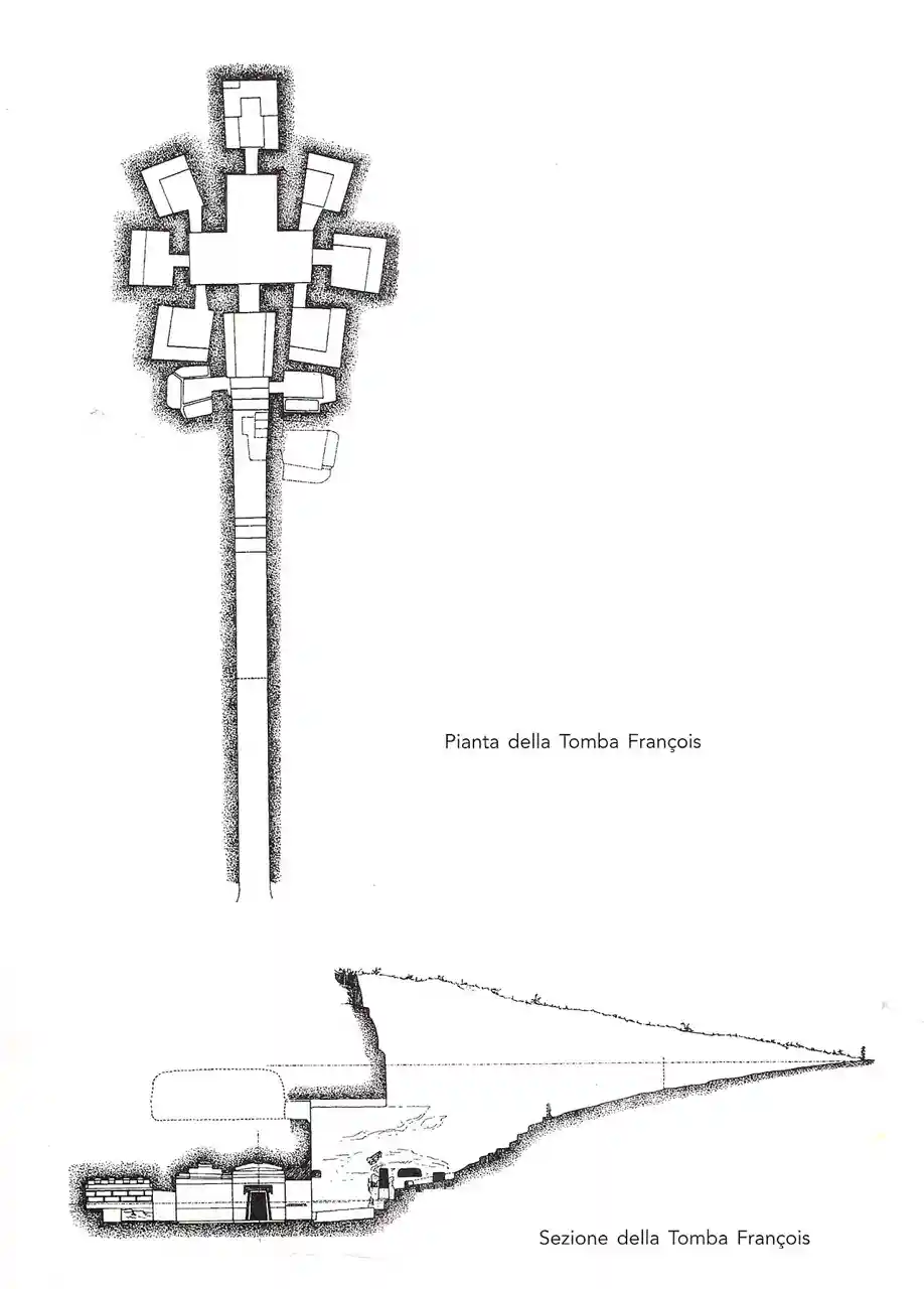 The François Tomb is an important painted Etruscan tomb from the Ponte Rotto Necropolis in the Etruscan city of Vulci, Lazio, in central Italy. It was discovered in 1857 by Alessandro François and Adolphe Noël des Vergers. It dates to the last quarter of the fourth century BC. The tomb seems to belong to the Etruscan family of the Saties (or Seties) and one of its chief occupants is Vel Saties, who appears with his dwarf, Arnza. Read more on Wikipedia