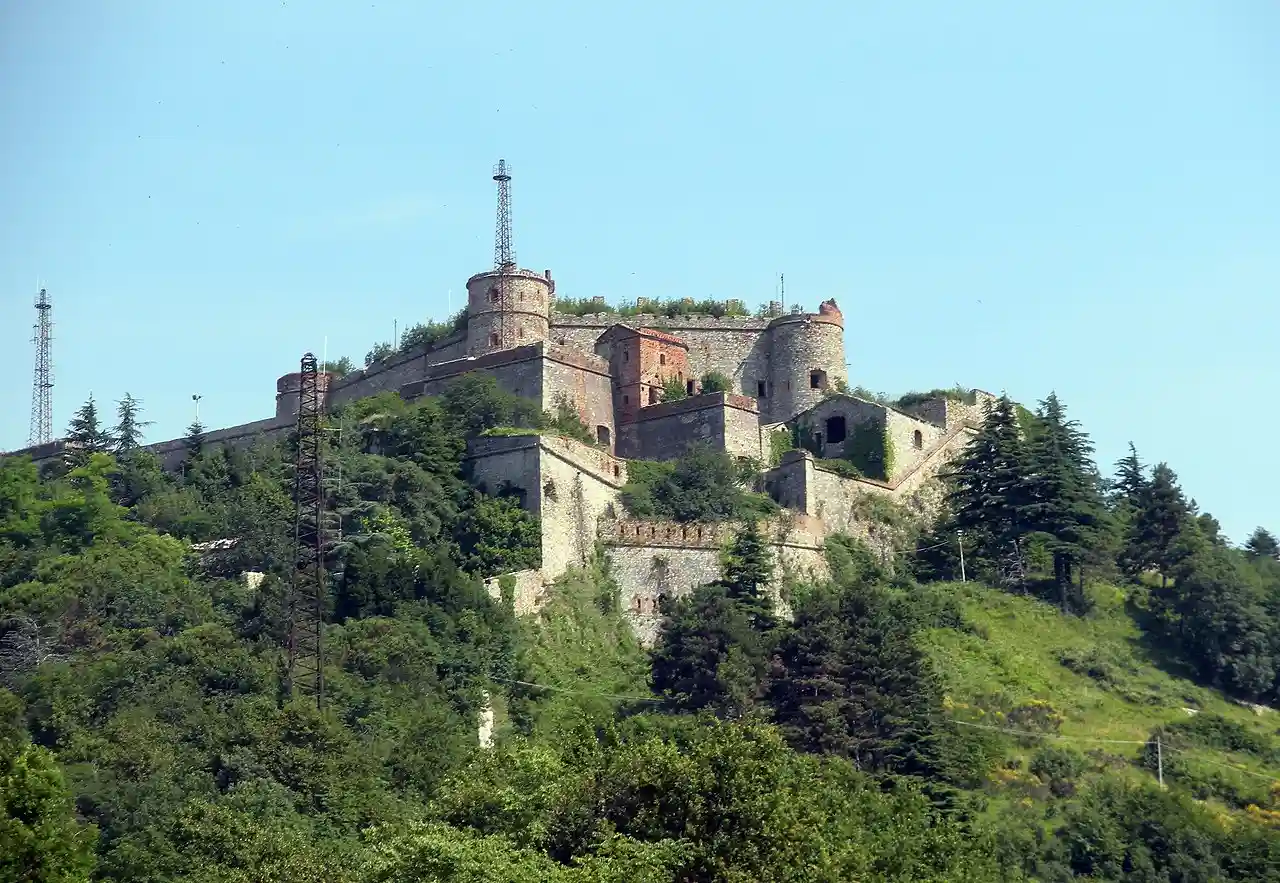 Forte Sperone is a fortification included in the "New Walls" built to defend the Italian city of Genoa, located on top of Mount Peralto. The union of two walls, one on the side of Val Polcevera and the other on the side of Val Bisagno, gives the fort the appearance of the bow of a ship, from which its name derives. Read more on Wikipedia