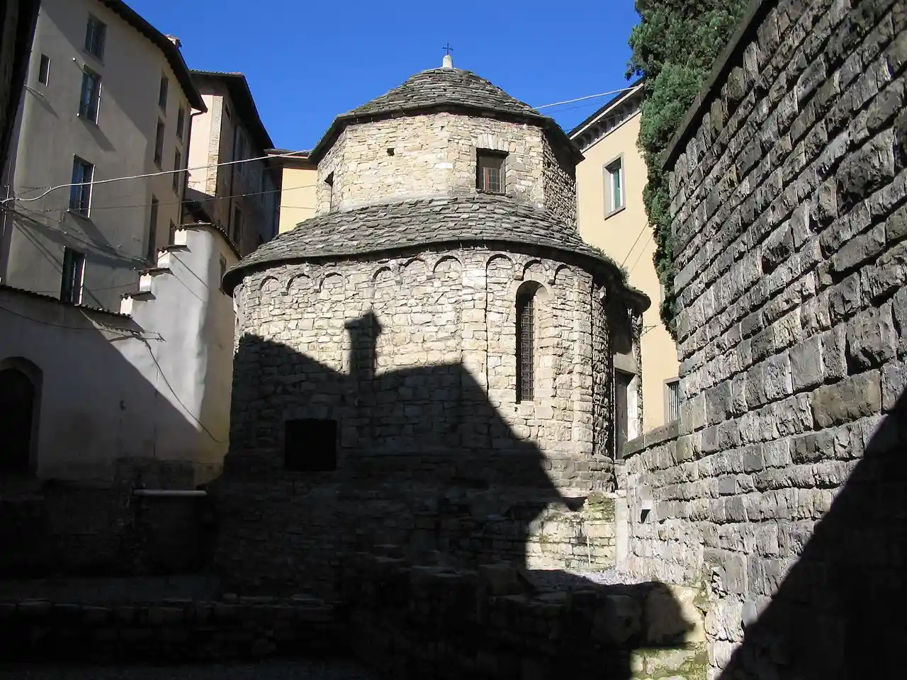 The Tempietto di Santa Croce is a small octagonal Romanesque chapel found in the upper city of Bergamo, near the Santa Maria Maggiore. The original building was constructed in the first half of the 11th century,L. Moris, A. Pellegrini, p. 118 op. cit. in bibliography. though first documentation of the structure dates to 1133. Read more on Wikipedia