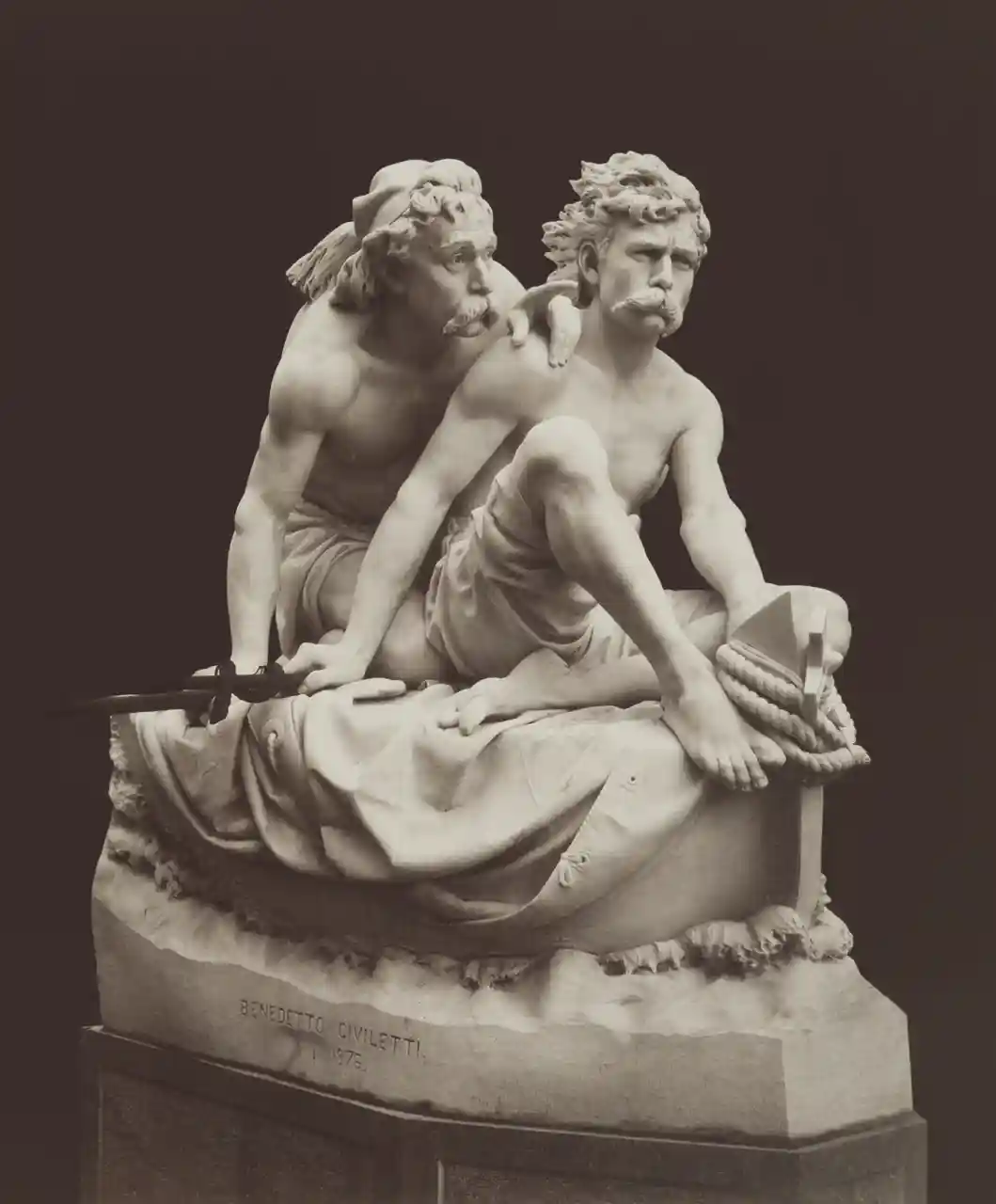 Kanaris at Chios (), also known as The Kanaris brothers (I fratelli Kanaris) or The sailors of the English Garden (I marinai del Giardino Inglese), is a marble sculpture completed by Benedetto Civiletti in Palermo, Sicily in 1878. It represents Konstantinos Kanaris (in front) and Andreas Pipinos at Chios, as they were sailing on board a fireboat towards the Ottoman flagship of admiral Nasuhzade Ali Pasha. This event, known as the burning of the Ottoman flagship off Chios took place on the night of 18 June 1822 during the Greek War of Independence, and was a reprisal for the Chios massacre which occurred two months earlier. Two thousand Ottoman sailors were killed, including Nasuhzade Ali Pasha himself. Read more on Wikipedia
