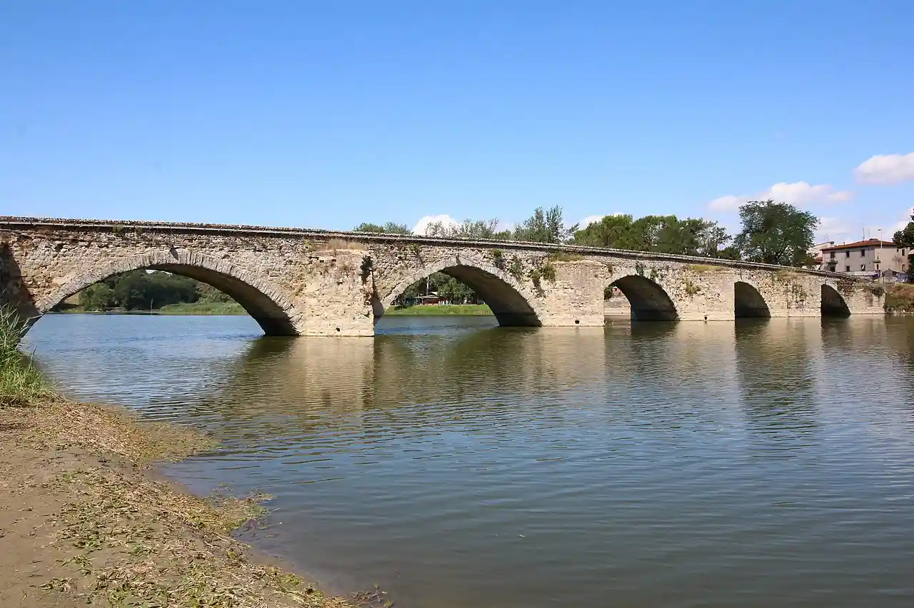 The Ponte Buriano is a 1277 stone seven-arch bridge that is located north of the town of Arezzo in the Tuscany region of central Italy. Some references tells that the bridge was used by Leonardo da Vinci in the lower-right quadrant of his painting Mona Lisa. Read more on Wikipedia