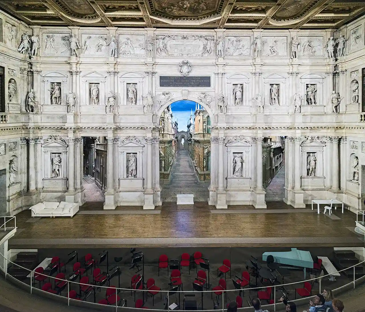 The ("Olympic Theatre") is a theatre in Vicenza, northern Italy, constructed in 1580–1585. It was the final design by the Italian Renaissance architect Andrea Palladio and was not completed until after his death. The trompe-l'œil onstage scenery, designed by Vincenzo Scamozzi to give the appearance of long streets receding to a distant horizon, was installed in 1585 for the first performance held in the theatre, and is the oldest surviving stage set still in existence. The full Roman-style scaenae frons back screen across the stage is made from wood and stucco imitating marble. It was the home of the Accademia Olimpica, which was founded there in 1555. Read more on Wikipedia