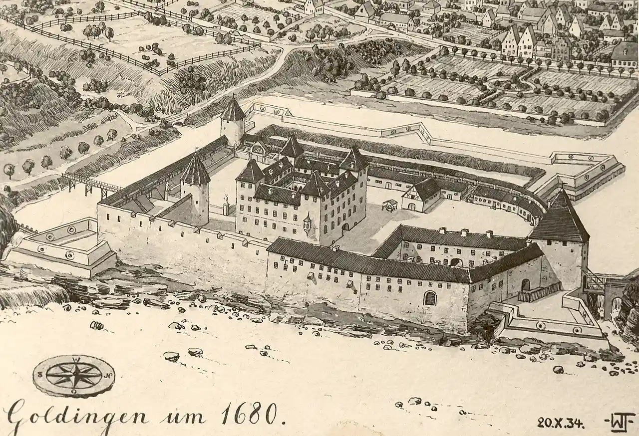 Kuldīga Castle (, ) also Goldingen Castle and Jesus Castle () Burgenlexicon für Alt – Livland Riga, 1922 was a medieval castle of the Livonian Order in historical Courland in town Kuldīga near Venta Rapid. Today on the left bank of the Venta at the end of the old bridge one can find the former castle mill, a castle guard's house and a city park with the castle ruins on Rumba Hill.Website www.pilis.lv Read more on Wikipedia